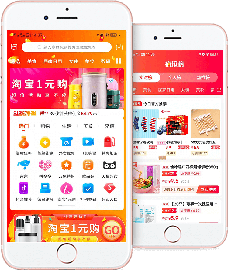 平台整合了淘宝、京东、拼多多、唯品会、苏宁、饿了么等主流电商平台,数百万款优惠券返利商品实时更新,全面覆盖衣、食、住、行等领域,品类齐全,应有尽有!